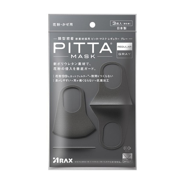 日本Pitta Mask【防粉尘花粉】高密合不勒耳可水洗3D防护口罩(黑灰Regular)3入